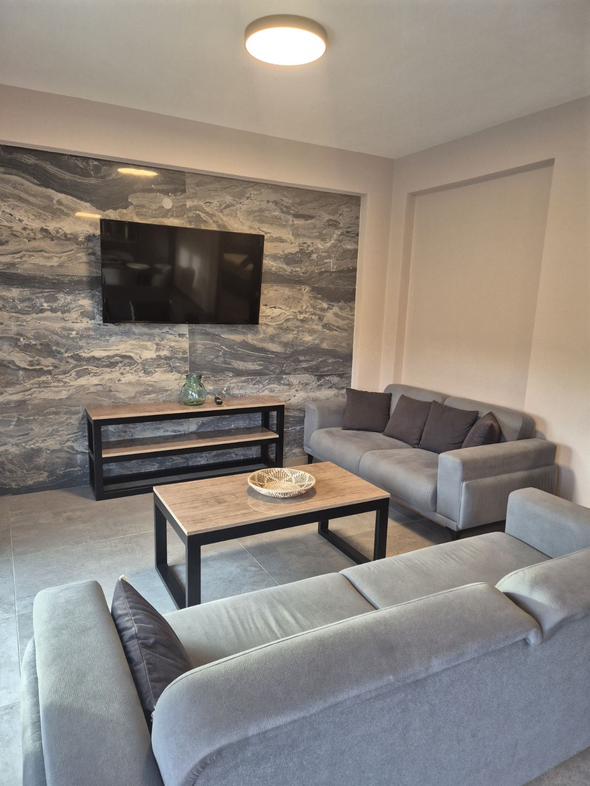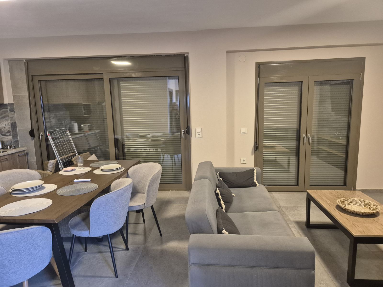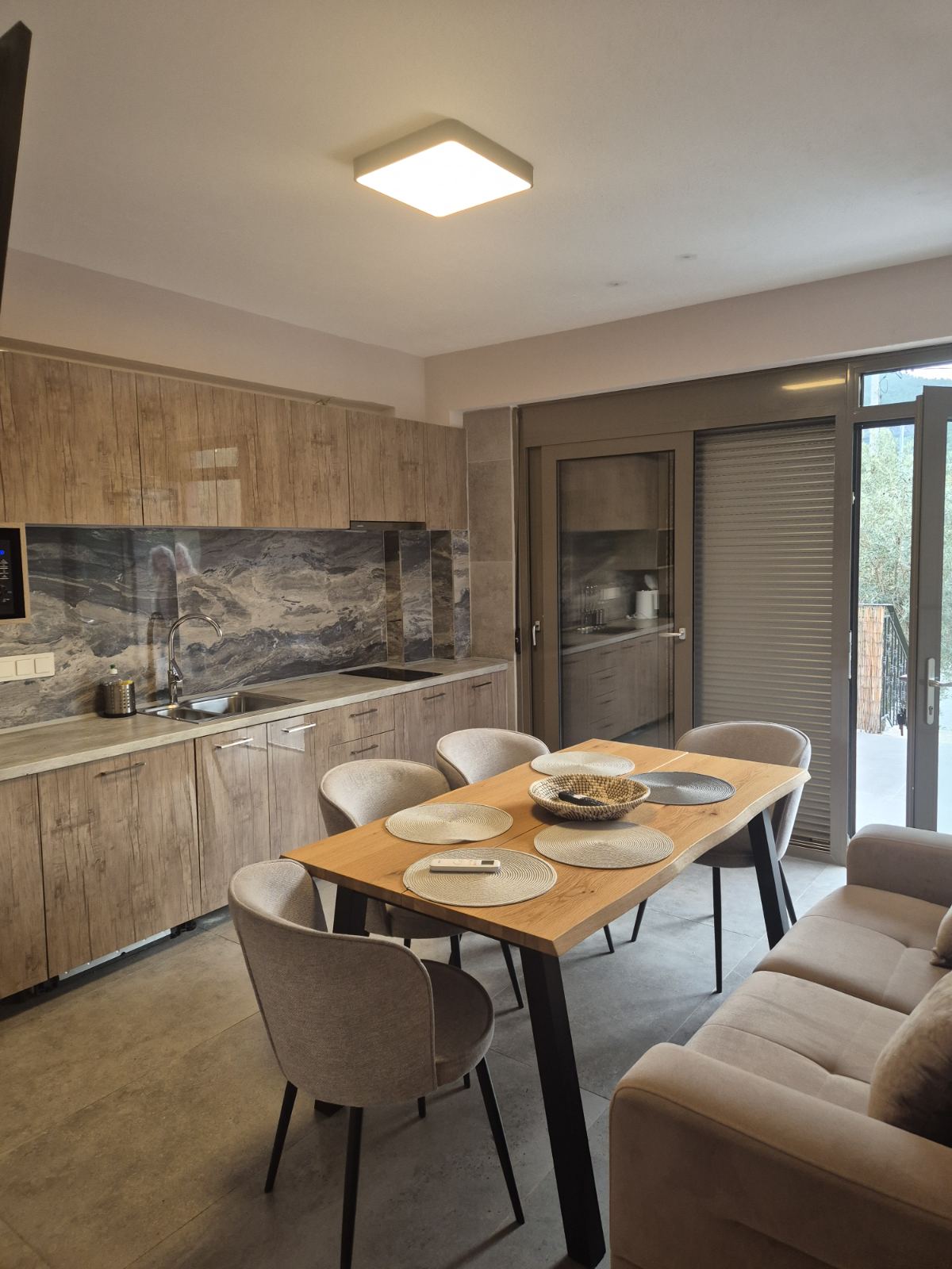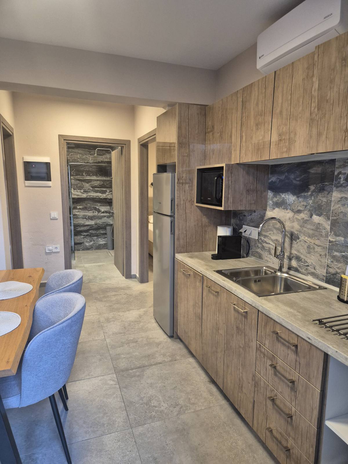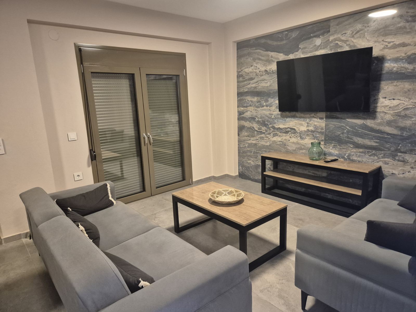 1/5 дуплекс – бр.1 – се наоѓа на прв спрат. Дуплексот располага со три големи простории. Има 2 посебни спални соби со брачни кревети и дневна просторија поврзана со трпезарија и кујна каде се наоѓа и кауч кој не се спушта. Кујната е целосно опремена, со најнов инвентар, исто така располага со тоалет и балкон на кој се излегува и има летна гарнитура за седење. Може да се сместат максимум 4 возрасни лица и 2 деца до 12 години. ( Има можност да се стави дополнително легло доколку се 2 деца до 12г)
