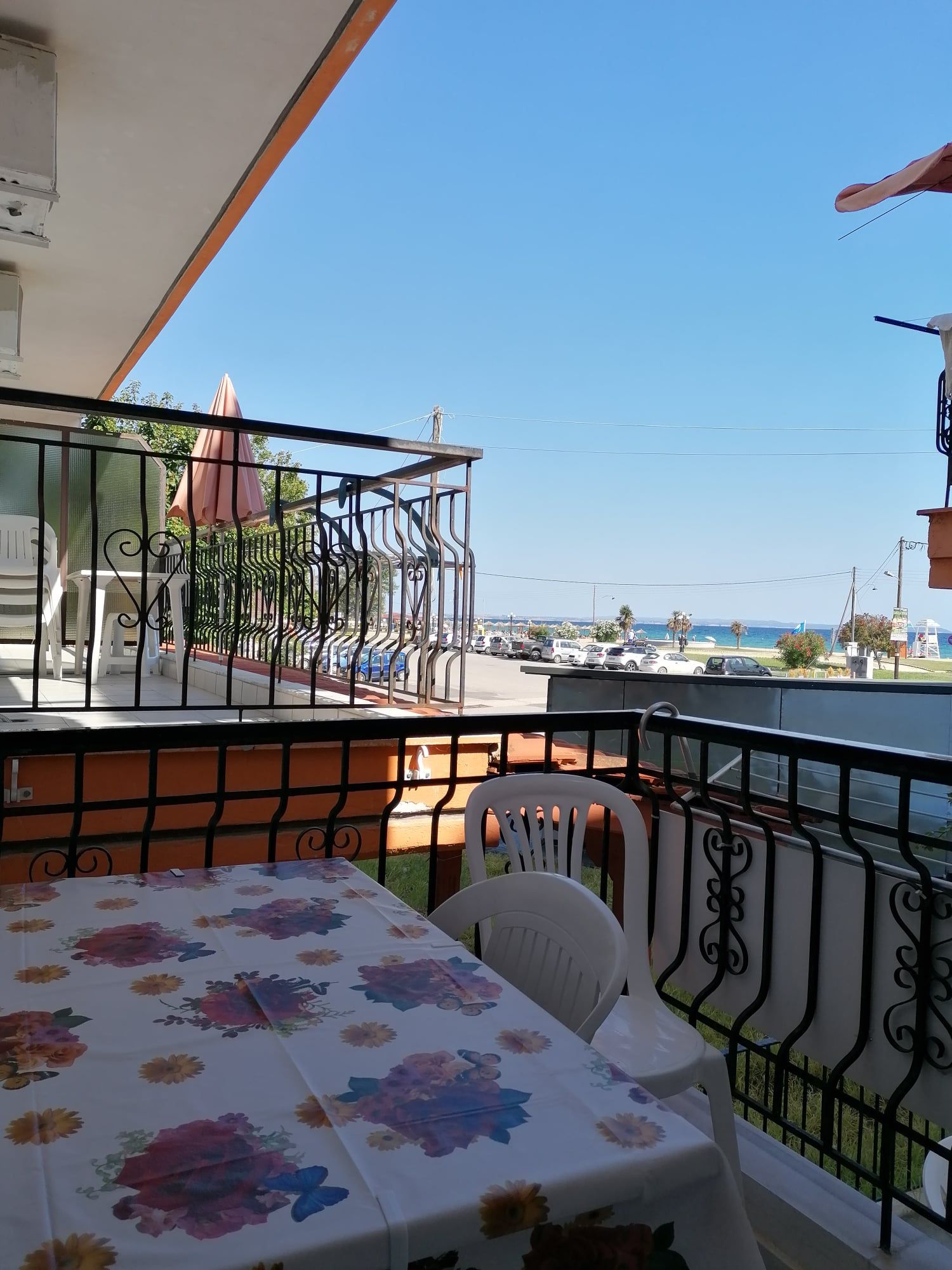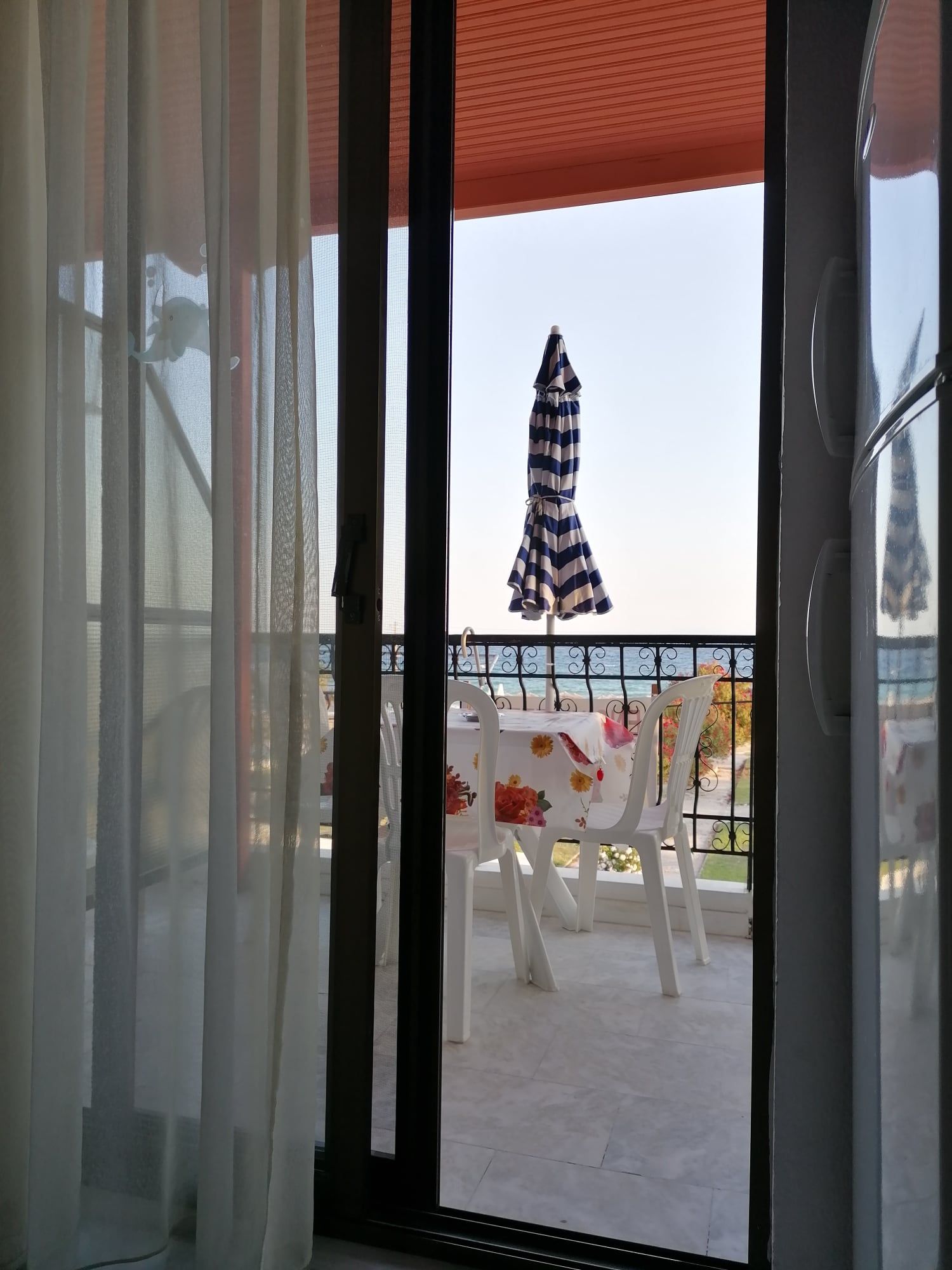 1/3 Студио бр. 10 – втор кат. Студиото има една просторија. На самиот влез има комплетно опремена кујна со мини шпорет со рерна, аспиратор и комплет садови за готвење и јадење. Во овој дел се наоѓа климата. Во продолжение на просторијата има еден брачен и еден единечен кревет, мебел, телевизор, фен  и голем фрижидер со одделна комора. Од студиото се излегува на терасата која има директен поглед на море и е опремена со пластична маса и столчиња. Има потесно купатило со туш.